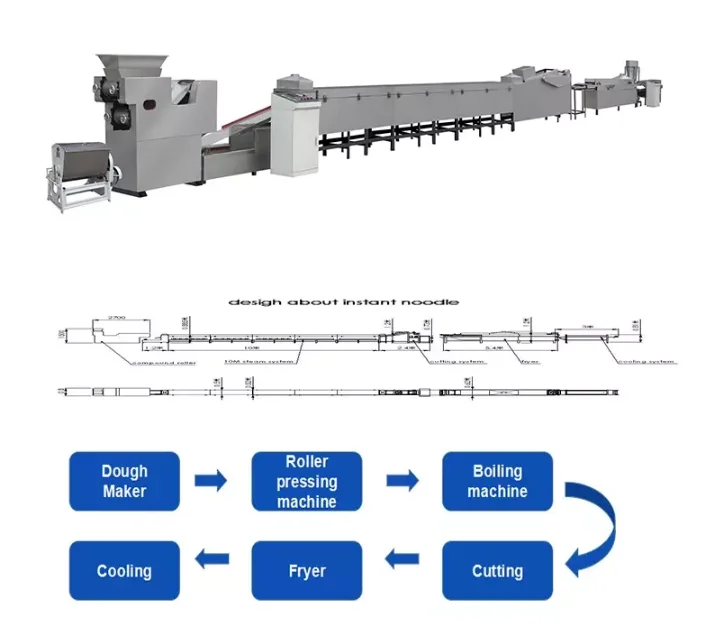 Kapacita: 80-100kg/h Výkon: 64kw Velikost: 6000*870*1200mm Funkce: Tento stroj na smažení nudlí a také na dokončení designu. The